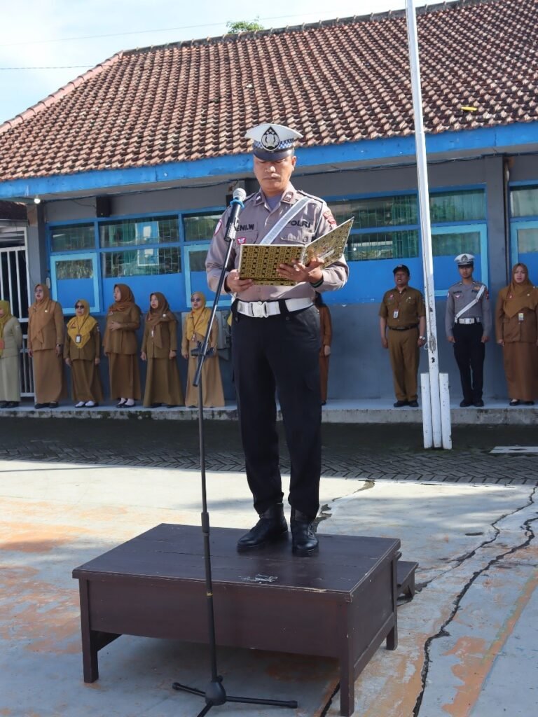 Karangploso, 15 Desember 2025 – SMP Negeri 1 Karangploso melaksanakan upacara bendera rutin yang diikuti oleh seluruh warga sekolah pada Senin pagi. Upacara berlangsung dengan tertib dan khidmat di lapangan sekolah. Bertindak sebagai pembina upacara, Aipda Jeni W dari Satuan Lalu Lintas (Satlantas) Polres Malang memberikan pembinaan karakter kepada siswa. Dalam amanatnya beliau menekankan bahwa disiplin merupakan kunci utama dalam membentuk kesuksesan. Beliau juga menyampaikan bahwa kebiasaan disiplin yang diterapkan sejak dini akan memberikan dampak positif bagi masa depan siswa.