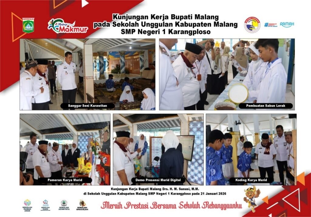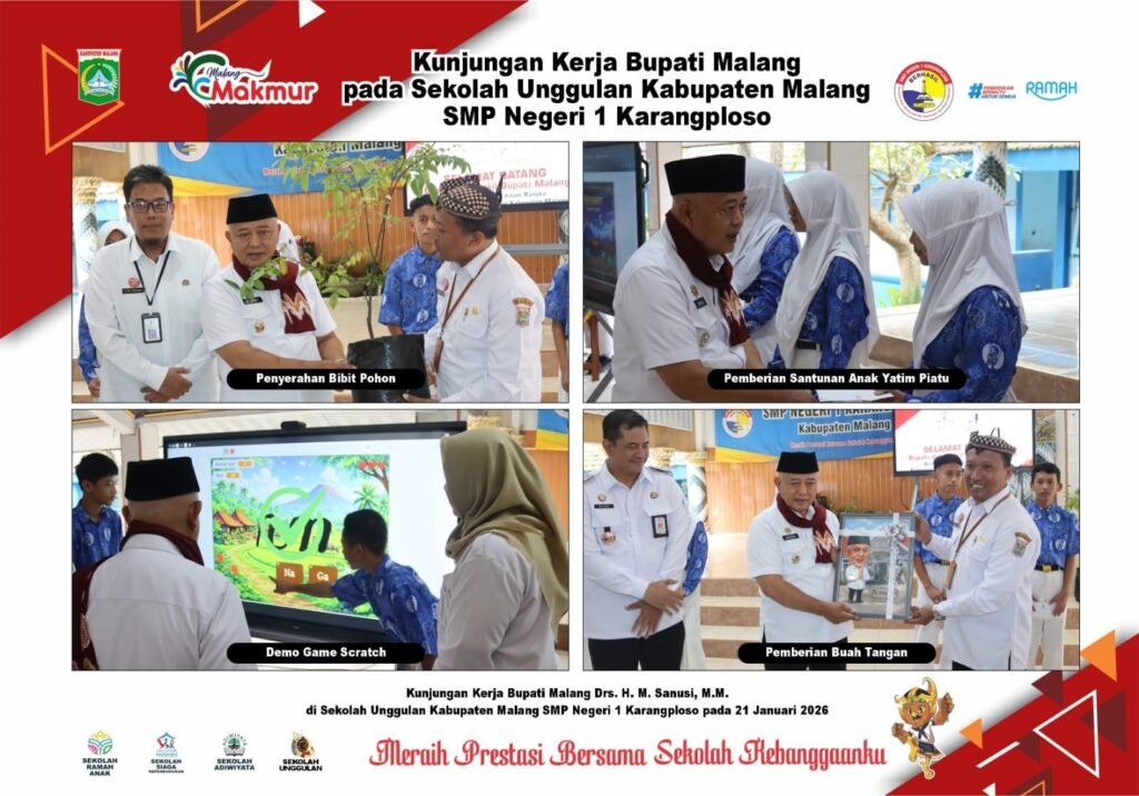 Karangploso, 21 Januari 2026 – SMP Negeri 1 Karangploso menerima kunjungan Bupati Malang, Drs. H. M. Sanusi, M.M., sebagai bentuk perhatian Pemerintah Kabupaten Malang terhadap pengembangan pendidikan dan Program Sekolah Unggulan. Kehadiran Bupati Malang disambut hangat oleh warga sekolah dengan menampilkan atraksi semaphore Pramuka. Dalam kunjungan tersebut Bupati Malang meninjau proses pembelajaran di kelas, Laboratorium IT dengan pembelajaran koding, Laboratorium IPA yang menampilkan produk hasil pembelajaran seperti sabun lerak, serta perpustakaan sekolah yang telah meraih akreditasi A sebagai pusat literasi unggulan. Bupati juga mengunjungi pendopo sekolah untuk melihat berbagai karya dan inovasi guru serta siswa, sekaligus menyaksikan penampilan seni karawitan sebagai wujud penguatan budaya sekolah.